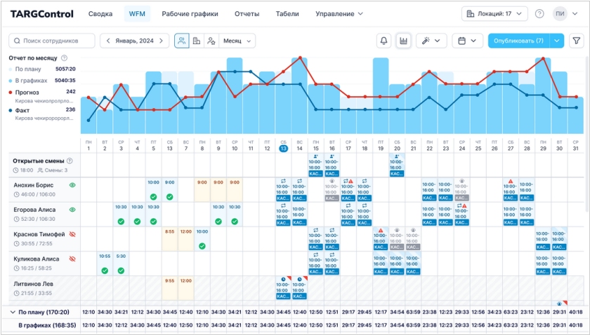 TARGControl - это WFM (Workforce Management) система управления персоналом и учета рабочего времени, которая автоматизирует составление графиков работы на базе искусственного интеллекта. Она помогает прогнозировать потребность в персонале, расставлять персонал по сменам, вести автоматический учет и контроль фактически отработанных часов сотрудников, перераспределение свободных сотрудников между объектами с незакрытыми сменами, автоматически заполнять табели на основе отработанного времени, осуществлять контроль доступа с использованием спец. оборудования или смартфонов/планшетов. TARGControl интегрируется с ERP-системами (1С, Босс-Кадровик, R-keeper и др.) и предоставляет удобную аналитику в режиме реального времени. Система поставляется вместе с мобильными приложениями для сотрудников и оборудованием СКУД.